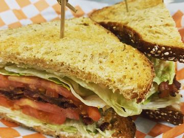 Crispy Bacon, Lettuce, Tomato and Garlic Aioli on toasted 9-Grain bread.
