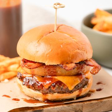 Topped with Cheddar Cheese, Bacon, Onion Ring and BBQ sauce