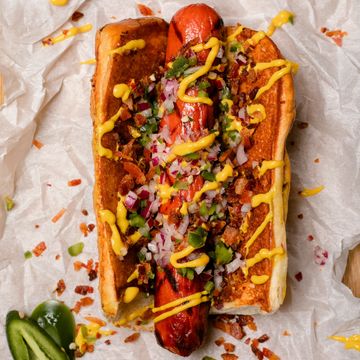 Topped with mustard, chopped bacon, diced onion and jalapenos