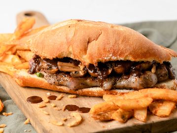 New York steak on a bolillo roll with sautéed mushrooms and crispy onions with a side of steak sauce