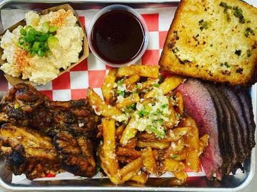 Choose your meat(s) - Tri Tip, Chicken and/or Sausage - and two sides. All plates come with garlic bread and our housemade BBQ sauce.