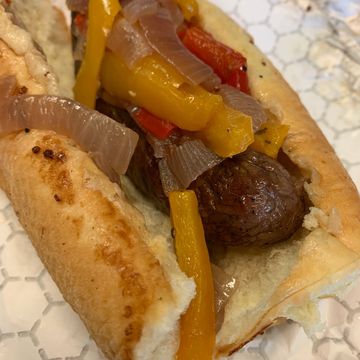 ZIO Swiss Sausage on a sweet Hawaiian baguette with sauteed bell peppers and onions