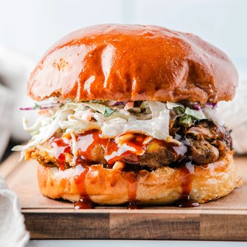 Our juicy pollo asado (BBQ chicken) on a toasted brioche bun topped with BBQ sauce and cilantro lime coleslaw