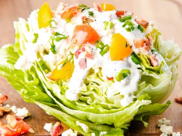 A local favorite. Crisp fresh iceberg wedge with our house creamy blue cheese dressing, crumbled blue cheese, bason, tomato and green onion